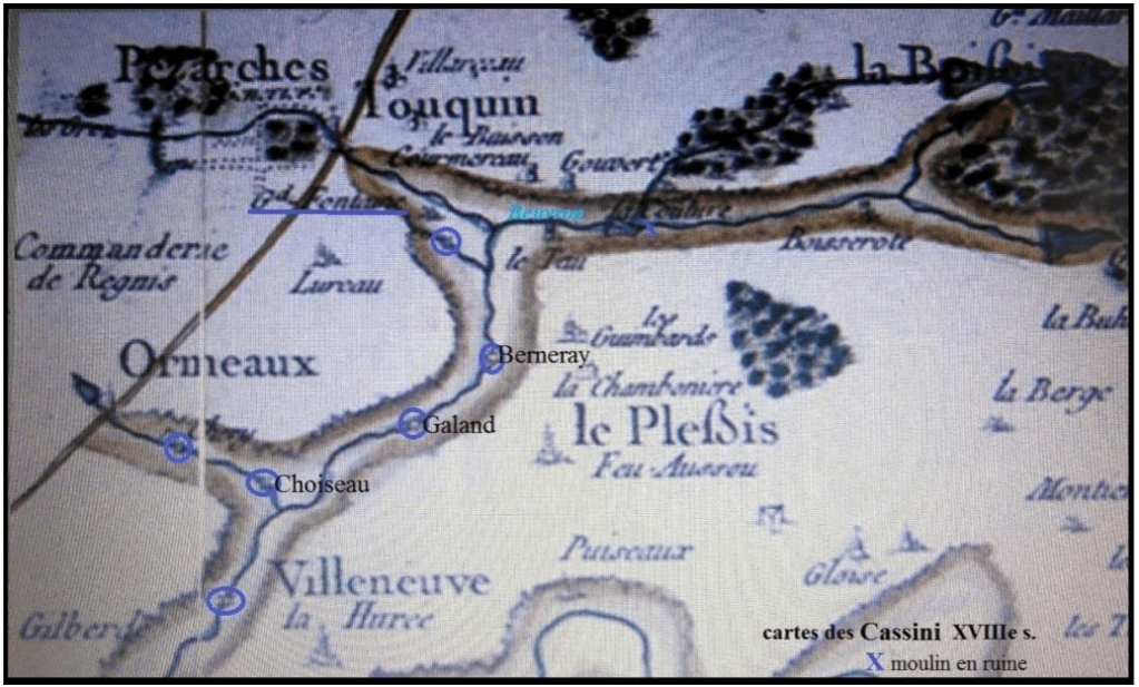 Touquin et ses alentours présentent de nombreux moulins. Sur cet extrait de la carte des Cassini, n’apparaissent que les moulins à eau :