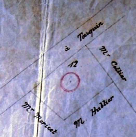 Deux moulins à vent existaient à Touquin. Le plus ancien, visible sur un plan du XVIIIe siècle de la seigneurie de Grand-Fontaine, se situe sur la route de Touquin à Pézarches. Vraisemblablement élevé sur une butte artificielle, il n’en reste que la tour circulaire en pierre dans le parc de Malvoisine. Ci-contre : le moulin à vent de Touquin – Plan du XVIIIe siècle de la seigneurie de Grand-Fontaine.