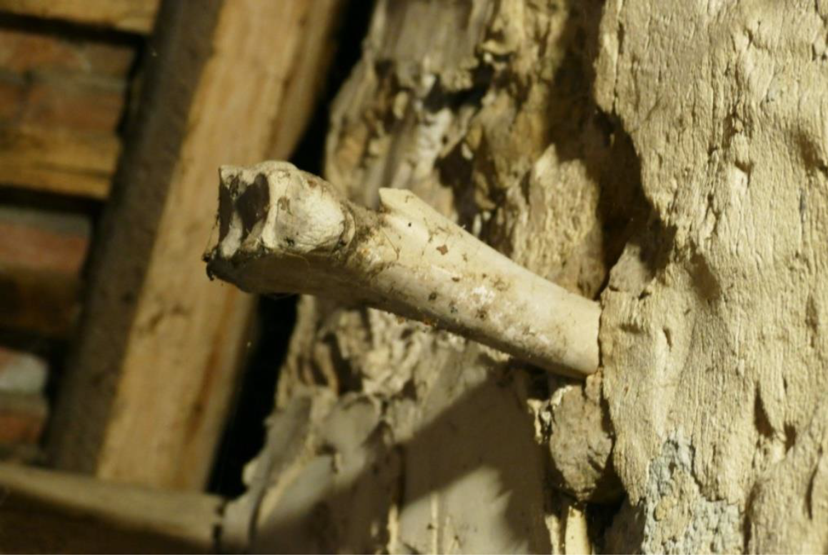 Il est donc tout à fait vraisemblable que ce pignon, exposé au sud, servait à palisser des arbres avec ces os alignés et très espacés à environ 2m50 de hauteur par rapport au sol. L’identification archéozoologique à distance réalisée par Jean-Claude LE BLAY a révélé des ossements de cheval (un métapode et un radius) ainsi qu’un fémur et un humérus de mammifères costauds, peut-être du cheval également. Les os montrent des traces colorées ce qui laisse penser qu’ils ont connu des vicissitudes climatiques ou des traitements indirects.