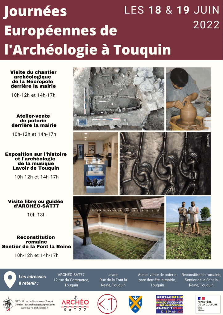 Les Journées Européennes de l’Archéologie se dérouleront les 18 et 19 juin 2022. A Touquin, nous vous avons concocté un super programme avec notre association amie et partenaire Castrum Tulquinum ! Au programme :